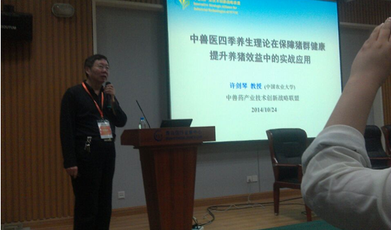中兽药产业技术创新战略联盟理事长、中国农业大学许剑琴许教授就中兽医四季养生理论在保障猪群健康、提升养猪效益中的实战应用上做了专题报告,内容主要从动物源性食品安全谈起、以及什么是养生与保健、四时养生与生猪保健、猪高热症辨证论治、母猪常见病证及中药保健等5个方面来介绍,为养猪业的健康发展指引了方向。