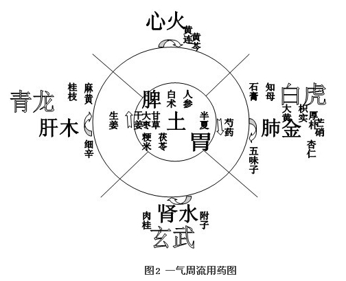 玄武者北方肾水。水的特性是藏,所藏为水中一阳,既肾阳。如若肾阳不足,则水寒侮土,水寒土湿。玄武汤是采用温渗之法以制水。其中以一味附子温癸水之寒,茯苓,白术健脾利水,生姜温脾土之寒,芍药清乙木之风。与玄武汤相类似的方剂还有四逆汤、白通汤、附子汤、麻黄附子细辛汤,麻附甘草汤等。这些汤证的用法,也是以北方肾水过寒为出发点用药,以完成阴阳升降,一气周流。有意者可以把这些方剂的组成与图2的一气周流用药图相对比学习,了解其中之意义。