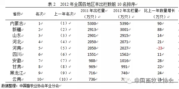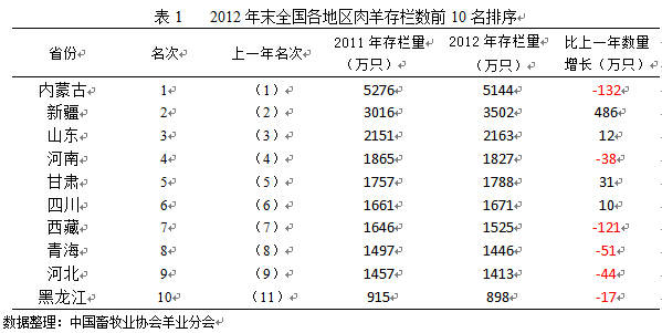 表2显示,2012年羊出栏数前十名地区中仅河南省的羊出栏数下降,较2011年减少23万只,其他省出栏数均有不同程度的增加,可以一定程度上说明我国羊产品的市场需求量逐渐增大,羊肉消费进步一增加。全国各地区羊出栏量排名顺序与2011年一致。