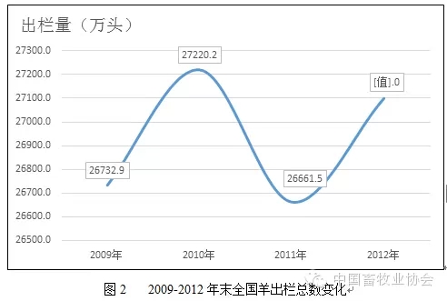 2012年我国羊出栏总数为27100万头,较2011年增加438.5万头(见图2),同比增长1.6%。