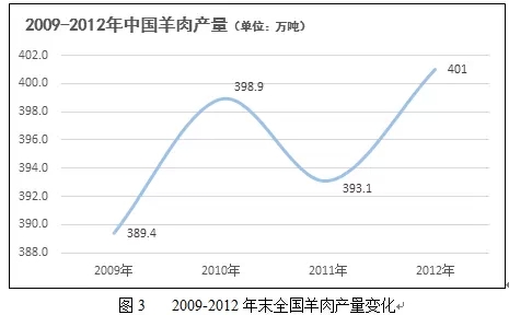 2012年我国羊肉产量为401万t,较2011年增加7.9万t,增长2%(见图3)。
