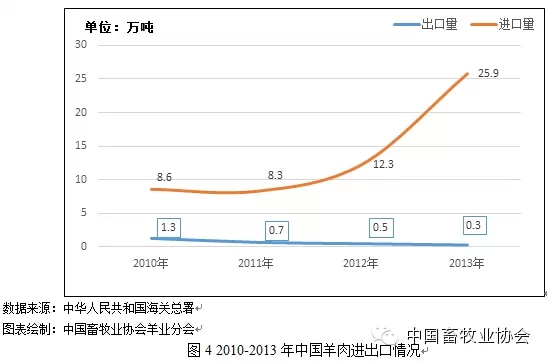 据统计,2013年我国羊肉进口总量25.9万吨,同比增长109.7%。种羊和羊肉产品进口国主要来源为澳大利亚、新西兰等国家。2013年我国出口羊肉总计0.3万吨,同比减少40%,主要出口地区为亚洲和中东地区等。