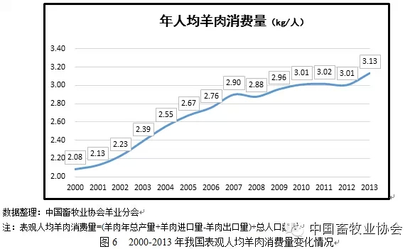 统计结果显示,2013年我国表观人均羊肉消费量为3.13千克/人,同比增长4.0%,比2000年增长50.5%。2000年起,羊肉消费量整体趋势一直处于稳步增长并稳步上升的态势。