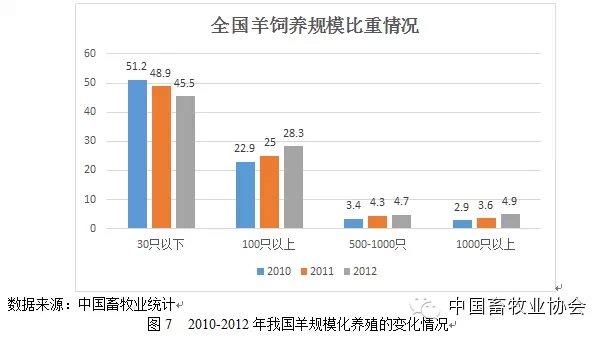 据不完全统计,2012年全国30只以下小规模饲养比重持续下降,100只以上规模化饲养比重持续增高,特别是500只和1000只以上规模化养殖比重明显提升,相比2012年羊年出栏头数为1000只以上的规模养殖场占全国羊饲养规模比重比2010年提高2个百分点(见图7),数量从2010年的3655个场增长到2012年的5994个,增长幅度高达64%。虽然规模化饲养比重不断提高,但散养户及小规模饲养仍是目前国内养殖业的主体,羊存出栏量增长乏力,部分传统优势产区还出现不同程度的存栏数下滑,全国性商品羊源紧张的问题依然严峻。
