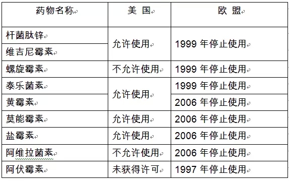 5. 欧盟禁令。欧盟禁令背后蕴涵着的“信号”表达了欧盟和美国采取了不同的政策,欧盟比美国实施了更为严格的限制措施。欧盟从2006年起停用最后四种药物饲料添加剂(见下表)表明,预防和消除危害刻不容缓。