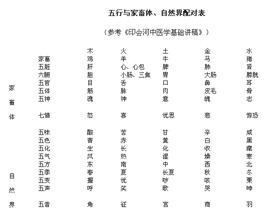 中兽医理论将五行学说用于说明家畜机体与自然的关系,主要体现在将五脏比类对应于五行,用五行之间的生克乘侮关系推论五脏六腑之间的相互协调、相互制衡情况。兽医鼻祖马师皇说:“马者,兽也。禀二气五行,长于灰台之下,与人并生于天地之间,有任重致远之功,代人之劳,而也待人之养(《元亨疗马集·马师皇问对脉色论》)。《元亨疗马集·论马口色者何也》谓:“夫肝者,东方木也,甲乙为主,壬癸相生,庚辛相克。色应左部卧蚕,合于周围排齿,旺于春季,寅卯辰月当权。……心者,南方火也,丙丁为主,甲乙相生,壬癸相克。……旺于夏季,巳午当权。……夫脾者,中央土也,戊己为主,火部相生,木星为难,应之于唇,合之于舌,旺于四季月末,辰戌丑未当权。……夫肺者,西方金也,庚辛为主,戊己相生,丙丁为难,色应右关,合于唇色,旺于秋季,申酉戌月当权。……夫肾者,壬癸水也,水星为主,金部相生,土星为难,应于排齿,合于玉户,旺在三冬,亥子丑月当权。”