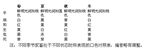 中兽医理论主要是运用五行生克乘侮规律来说明脏腑病变后相互间的影响或传变。不过病邪传变与否,关系到某一脏的虚实,即所谓“虚则受邪,实则不受邪”。其次也关系到病邪的性质和治疗的措施,故不能将五脏病邪传变与五行生克机械死板地硬套。《马师皇问对脉色论》在论及不同季节诊察口色,以判断家畜机体平、病、和、生、危、死,就是运用五行生克理论进行判断的。如:春者,肝旺也,甲乙当令,壬癸相生。凡口中之色鲜明光润如桃色者,平;白者,病;红者,和;黄者,生;黑者,危;青者,死。何谓平?春色如桃,百病俱消。白色者,肺金之色也,春现者,病,盖木逢金也。黄色者,脾土之色,春见者,生,盖肝病传脾,木赖土滋也。黑色者,肾水之色,春见者,危,盖三春黑色,五脏灭绝。青色者,肝木之色,春见者,死,盖春间青紫,木亏肝死。下表为四季口色与机体状况之关系表。