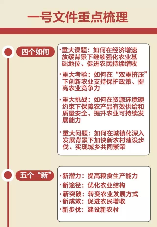 改,改革创新,这是贯穿整个1号文件的一个字。从具体部署看,其中若干项有望在今年取得新突破——构建新型农业经营体系,农村集体产权、土地、金融等体制改革,水利林业改革,种业科研成果权益分配改革,涉农转移支付制度、农业补贴制度改革,等等。