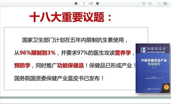 十八大重要议题:国家卫生部门要在五年内限制抗生素的使用率从96%限制到3%,并要求97%的医护人员攻读《临床营养学》、《预防学》,同时大力倡导功能保健品的使用!