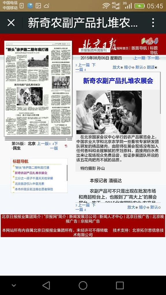 2015年8月5日,北京农学院中关村开放实验室展位亮相2015北京国际农业、农产品博览会,刘凤华教授团队药食同源科技成果携中悦民安(北京)科技发展有限公司出品的“五悦”精品猪肉首次亮相。