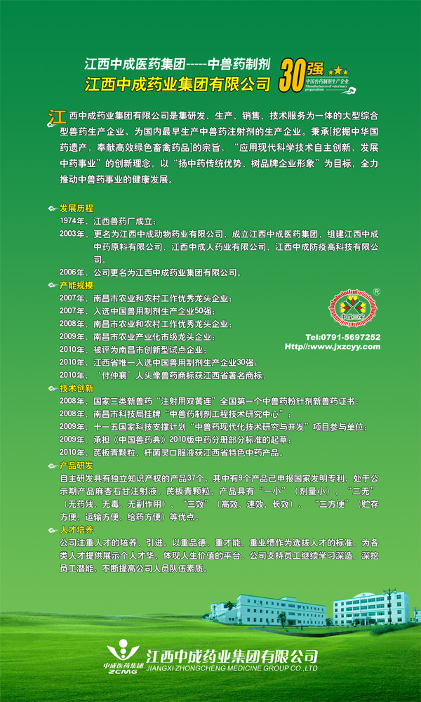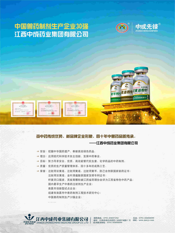 江西中成药业集团有限公司隶属江西中成医药集团,始创于上世纪七十年代初,是集中兽药制剂研发、生产、销售为一体的高科技创新企业,目前为国内设备最新最全、产品剂型最齐、生产最早、规模最大、销售网络最广的中兽药生产企业。至今拥有粉针、水针、口服液、片剂、颗粒剂、粉剂、散剂、预混剂、消毒剂九个剂型的GMP生产线,另外公司投资扩建的大容量注射剂生产线将于今年内通过农业部GMP认证。公司目前拥有上百个自主创新的产品,其中“双黄连粉针”填补了兽药行业中药粉针的空白。在未来发展形势下,公司将竭力开发更多名优精品类中兽药产品服务于畜牧养殖业。