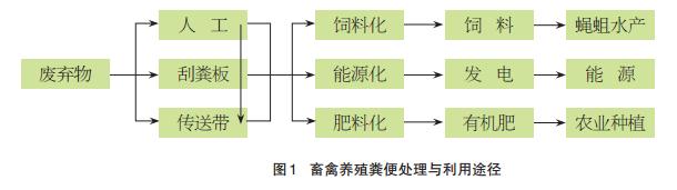 在发霉饲料、饲料浪费、污水、羽毛、死淘鸡和粪便等诸多废弃物中, 处理难度最大的是后两者。 通过对424 家养殖场的调研发现,78.74%的养殖厂能够按照国家的要求将死淘鸡进行无害化处理, 其中 71.25%的养殖采用深埋的方式, 26.5%的养殖场选择焚烧, 2.25%选择化尸池。 但仍然有 21.26%的养殖场没有采取上述措施,将死淘鸡出售、喂狗或丢弃处理。通常, 畜禽养殖粪便可以采取饲料化、能源化、肥料化等多元方式进行处理(见图 1)。但在调查中发现, 中小型养殖场在清粪方式上选择人工的比较多, 81%的养殖户出售给有机肥和水产饲料加工企业。 近 12%是自用, 肥田、水产饲料或生产沼气。 也有部分养殖户废弃不管。