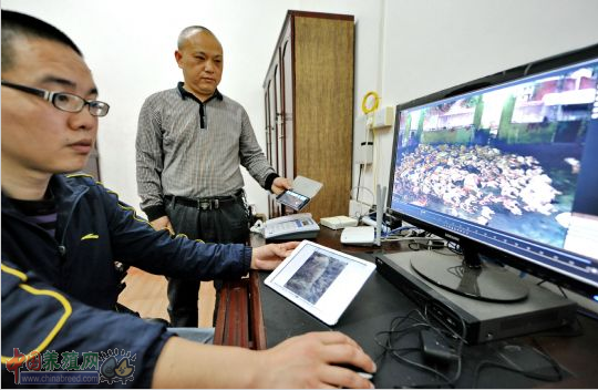 龙岩市新罗区大池镇龙大病死禽畜无害化处理厂吴健敏(左)通过网络监看当天无害化处理工厂里病死猪收集及处理情况(3月19日摄)。