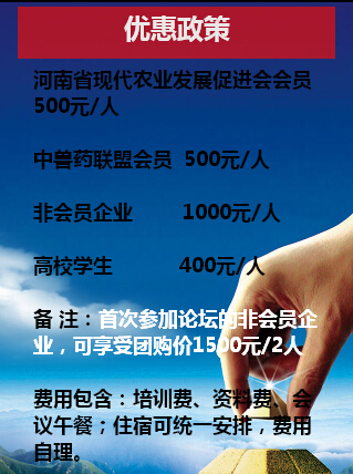 培训费用:中兽药联盟会员、河南省现代农业发展促进会会员 500元/人;非会员企业 1000元/人,首次参加论坛的非会员企业,可享受团购价1500元/2人。