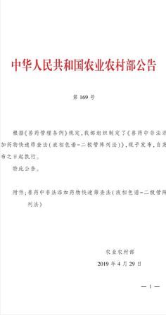 日前,国家发布了史上最为全面、明确和精准的非法添加物检查、检测和确证办法,以“农业农村部公告第169 号”文件向全国各监督、检验和执法机构发布通知。文件相比以往公布的非法添加物数量来说,这次一次性公布了150多种常用和近几年人药、兽药新上市的常用和特效药物。这次公布的非法添加物成分数量,是过去十多年的十倍十几倍,几乎涵盖了现有人药和兽药的所有药物。